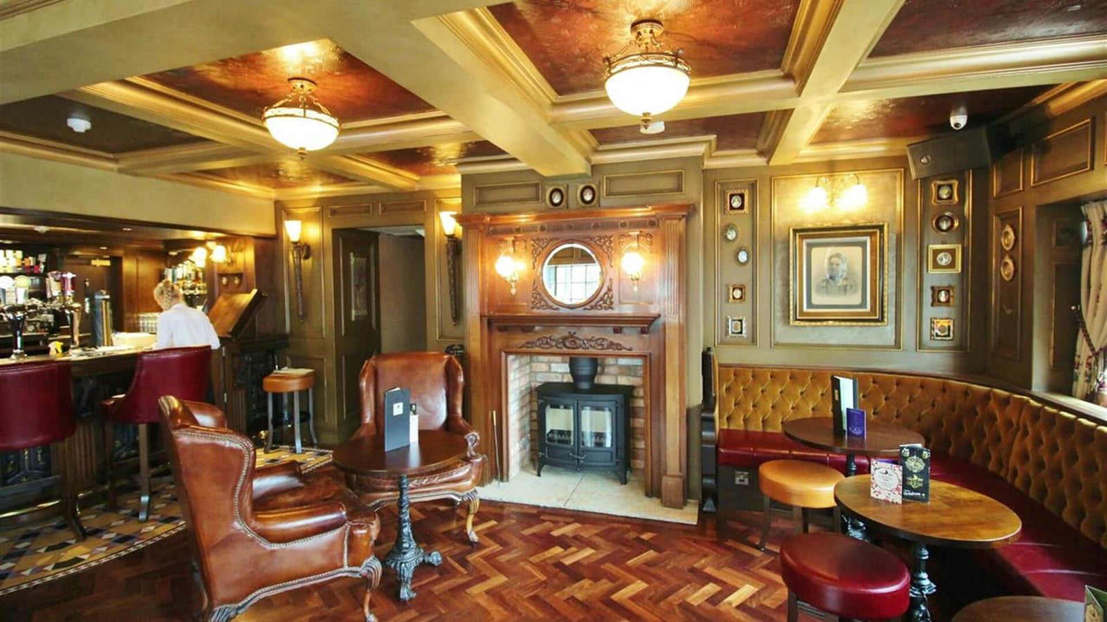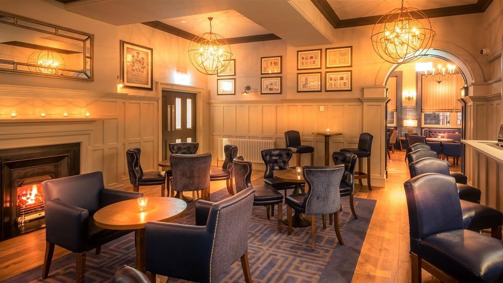 The Public Bar on the ground floor is a long hall bar with wooden paneling, high ornate ceiling and a crackling open fire which adds to the cozy intimate atmosphere.